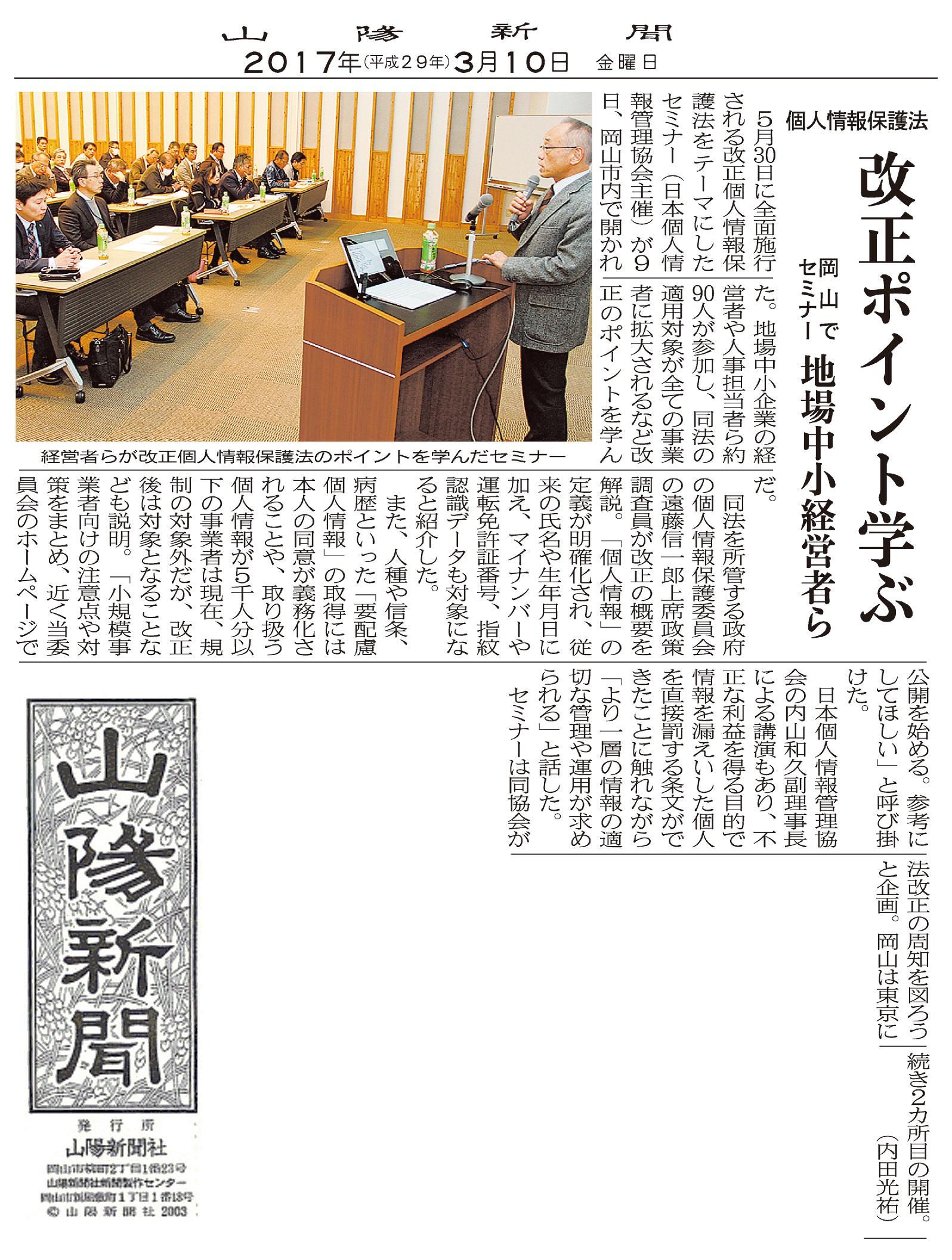3月9日、岡山市内で開催された「 改正個人情報保護法セミナー」の模様が、3月10日の山陽新聞に掲載されました。